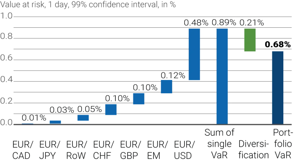 To this end, the potential loss resulting from a currency devaluation must be compared to the potential liquidity burden arising from the planned hedging transactions due to a foreign currency appreciation. For example, the analysis of the value at risk of the entire currency allocation shows both the economic risks of the unhedged currency portfolio and the diversification effects resulting from the allocation (see figure 1).