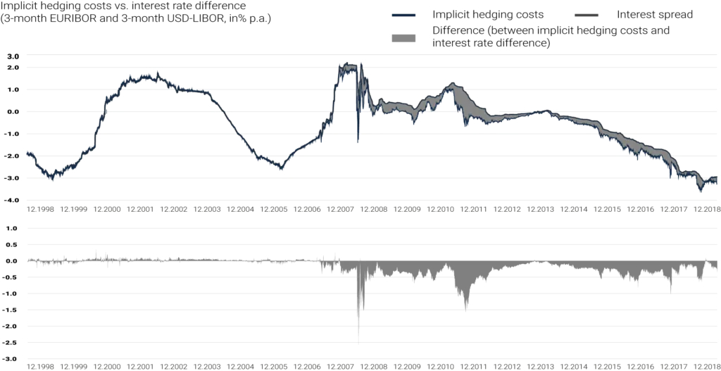 The market environment of individual currency pairs also has an impact on the design of the hedging strategy. In particular, the difference in interest rates between the investment and the home currency is an important aspect. The interest rate difference is paid out as part of a currency hedge. If there is a significant interest rate differential in two currency areas, e.g. currently 2.9% p.a. (Source: 7orca Asset Management AG, Bloomberg. EUR/USD forward spread approx. 2.9% p.a. in 3 month tenor. 30.04.2019) between the United States and the Eurozone, the interest rate differential to be paid out within the currency hedging strategy is particularly expensive. This also applies to the hedging of many emerging market currencies. In addition to different interest rate levels, the phenomenon of cross-currency basis spreads can also influence hedging costs. Put simply, it is a measure of the supply and demand ratio of two currencies and since 2008, it has been structurally negative for a EUR-based investor hedging USD holdings. This is an important factor, as it has a direct impact on the cost of a currency hedging strategy. In contrast to a higher interest rate level, an investor is not remunerated for the basis spread. In the USD example, the hedging costs paid exceed the interest rate differential between the two countries (see figure 2). If the investor has a strong market opinion on the development of currency pairs, this should be taken into account in the hedging strategy.