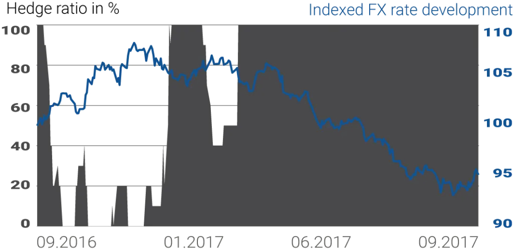 Figure 3 shows an example of the effect of an active currency overlay using a USD long position in the period from October 2016 to September 2017. This is a good illustration of the added value of an active hedging strategy. While the largely unsecured position clearly participated in the positive market development in the fourth quarter of 2016, the active build-up of the hedge at the end of 2016 largely protected the position until September 2017.