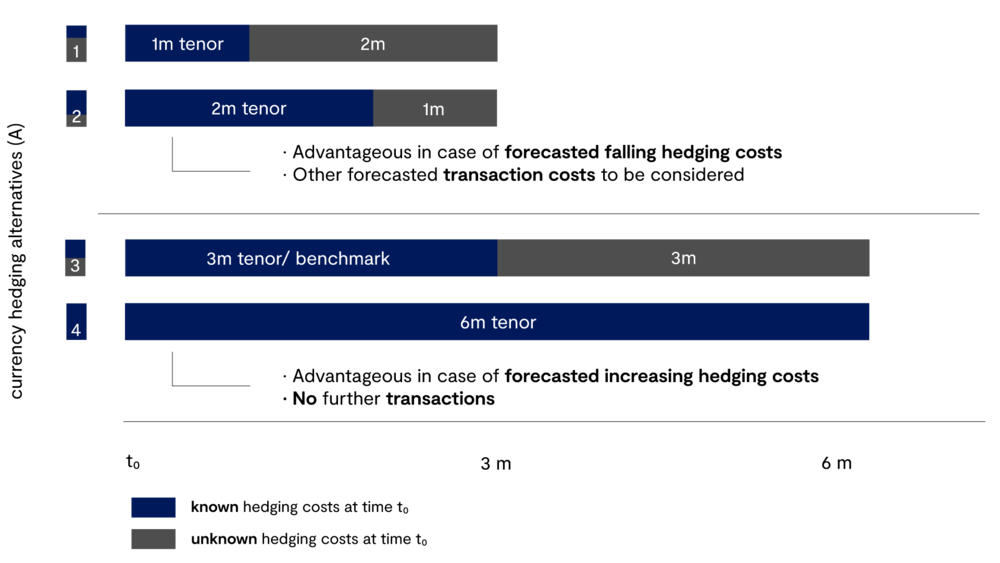 A negative basis spread adds to the hedging costs and therefore must be internalised in the hedging costs of the tenor selection process. For more details on how cross-currency basis spread affects hedging costs, please refer to our earlier publication on the basis spread.