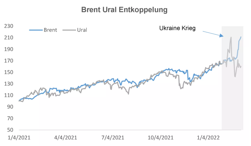 Abb. 1 | Indexierter Preis des Brent vs. des im Ural geförderten Öls.