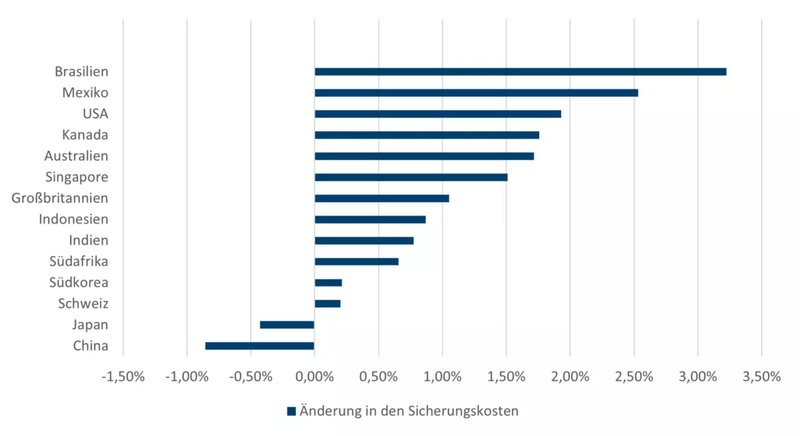 Das unterschiedliche Anpassungstempo der Zentralbanken dominierten und dominieren in diesem Zusammenhang die Devisenmärkte. Sowohl in den Wechselkursen als auch in den Sicherungskosten (respektive Erträgen) macht sich diese Dynamik bemerkbar. Für eine Mehrzahl der relevanten Wirtschaftsräume ergaben sich seit Jahresbeginn deutliche Ausweitungen der Sicherungskosten aus der Perspektive eines in Europa ansässigen Investors (vgl. Abbildung 3).