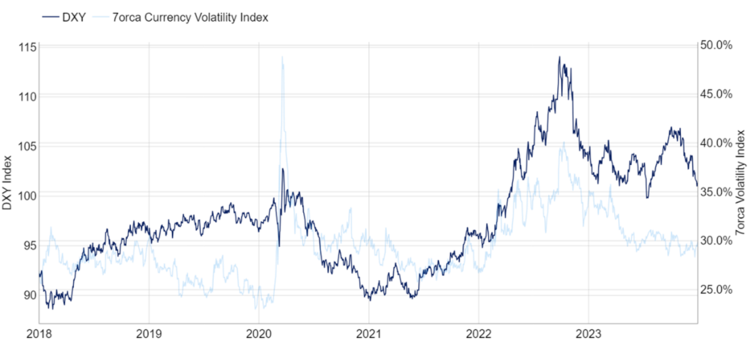 Abbildung 2: U.S. Dollar Index (DXY) vs. 7orca Currency Volatility Index