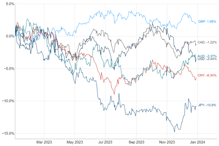Die Bank of England (BoE) verzichtete auch in der Dezembersitzung auf eine Zinsanpassung. Wie zuvor stimmten die Zentralbanker mit 6:3 für die Beibehaltung der aktuellen Zinssätze. Drei Mitglieder stimmten für eine Erhöhung um 25 Basispunkte. Die BoE projizierte die erste Zinssenkung für Q3 2024 und damit zu einem späteren Zeitpunkt als beispielsweise die Fed. Das Mantra „Higher for Longer“ ist außerdem in den längerfristigen Prognosen ersichtlich. Zum Ende des Jahres 2026 sieht die BoE die Zinsen bei immer noch hohen 4,25%. Die Inaktivität der EZB und der BoE führten im vergangenen Jahr zu einem seitwärts oszillierenden EUR/GBP. Sollte die EZB bald mit den Zinssenkungen beginnen, spräche dies bei einer konservativeren BoE für eine GBP-Stärke aus geldpolitischer Sicht.