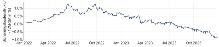 Das Basisszenario bleibt hier also eine homöopathische Anpassung der Zinsen am kurzen Ende der Zinsstruktur, die eine hohe Volatilität im EUR/JPY auslösen dürfte, allerdings wenig an dem breiten Zinsdifferential ändern würde. Den viel größeren Effekt sollte die baldige Umkehr im Zinszyklus der EZB haben. Die zweite Jahreshälfte könnte erste Zinssenkungen mit sich bringen und damit der bisherigen Abwertungsdruck auf den JPY schwächen und zu abrupten Aufwertungen im JPY führen. Dieses Szenario ist bereits in der Sicherungsstruktur im EUR/JPY zu beobachten (vgl. Abbildung 10). Die Sicherungserträge eines 12-monatigen Devisentermingeschäfts sanken im Juli erstmals unter jene eines annualisierten 3-Monatsgeschäfts. Dies impliziert, dass der Markt einen Rückgang der Zinsdifferenz einpreist. Die Höhe des Rückgangs suggeriert, dass diese Bewegung insbesondere von der Eurozone ausgehen sollte.