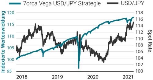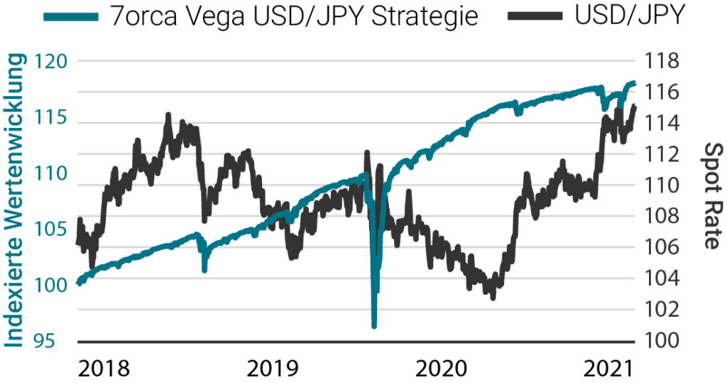 Quelle: 7orca Asset Management AG, Bloomberg. 01.01.2018 – 31.12.2021. Die Wertentwicklung der Vergangenheit ist kein verlässlicher Indikator für zukünftige Ergebnisse. Die Wertentwicklung wird nach der BVI-Methode ermittelt (ohne Ausgabeaufschläge). Bei der dargestellten Wertentwicklung handelt es sich um die isolierte Wertentwicklung (Carve-Out) der Optionsstrategie auf den USD/JPY-Future des Investmentfonds 7orca Vega Return, Anteilklasse I. Zusätzlich kann das Anlageergebnis um die individuell anfallenden Depotkosten reduziert werden.