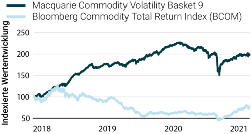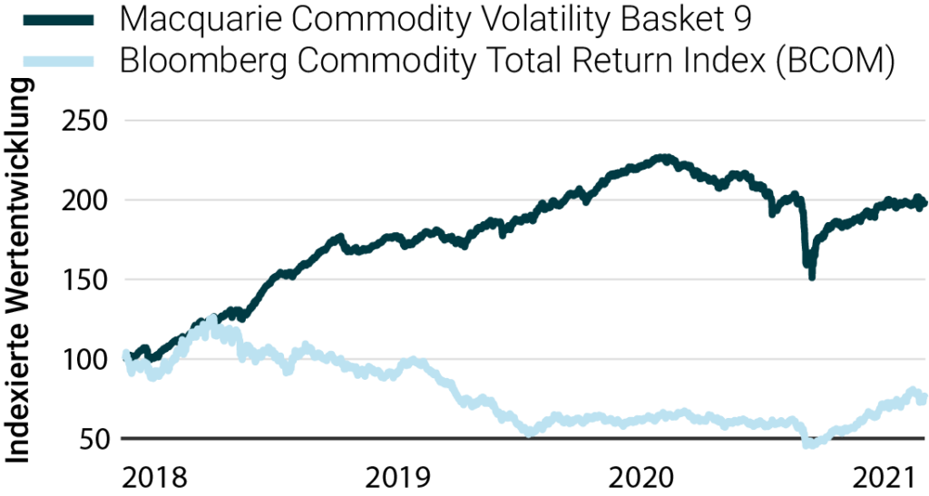 Wie wir bereits beschrieben haben, folgen die Rohstoffpreise Angebot und Nachfrage und können je nach Verfügbarkeit oder Verknappung des Rohstoffs entscheidende Preisschwankungen aufweisen. Um dies auf verständliche Weise zu veranschaulichen, stellen wir in Abbildung 8 eine passive Investition in ein diversifiziertes Rohstoffportfolio dar, das durch den Bloomberg Commodity Index Total Return repräsentiert wird, der in den letzten 12 Jahren enttäuschende Ergebnisse erzielte. Der Index ist seit 2010 leicht negativ. Im Gegensatz dazu erzielte eine Volatilitätsstrategie auf einen diversifizierten Rohstoffkorb, wie den Macquarie Commodity Volatility Basket 9 Index, im selben Zeitraum eine vielversprechendere und beständigere Rendite.