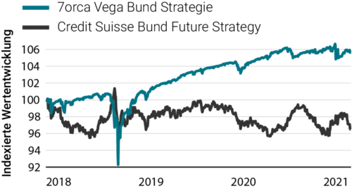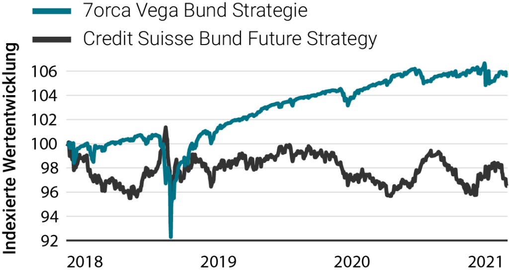 Quelle: 7orca Asset Management AG, Bloomberg. 01.01.2018 – 31.12.2021. Die Wertentwicklung der Vergangenheit ist kein verlässlicher Indikator für zukünftige Ergebnisse. Die Wertentwicklung wird nach der BVI-Methode ermittelt (ohne Ausgabeaufschläge). Bei der dargestellten Wertentwicklung handelt es sich um die isolierte Wertentwicklung (Carve-Out) der Optionsstrategie auf den Bund Future des Investmentfonds 7orca Vega Return, Anteilklasse I. Darüber hinaus kann das Anlageergebnis um die individuell anfallenden Depotkosten reduziert werden.