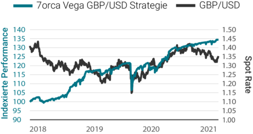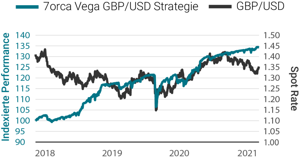 Quelle: 7orca Asset Management AG, Bloomberg. 01.01.2018 – 31.12.2021. Die Wertentwicklung der Vergangenheit ist kein verlässlicher Indikator für zukünftige Ergebnisse. Die Wertentwicklung wird nach der BVI-Methode ermittelt (ohne Ausgabeaufschläge). Bei der dargestellten Wertentwicklung handelt es sich um die isolierte Wertentwicklung (Carve-Out) der Optionsstrategie auf den GBP/USD-Future des Investmentfonds 7orca Vega Return, Anteilklasse I. Darüber hinaus kann das Anlageergebnis um die individuell anfallenden Depotkosten reduziert werden.