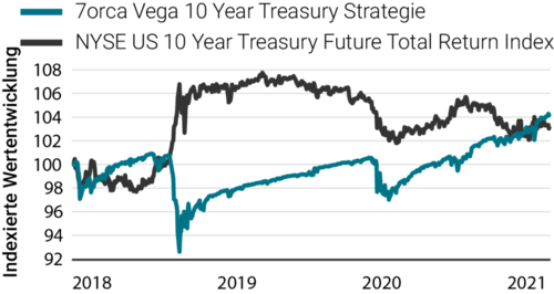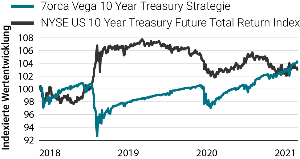 US-Treasury-Futures zeigte vergleichbare Ergebnisse wie die Bund-Strategie. (Quelle: 7orca Asset Management AG, Bloomberg. 01.01.2018 – 31.12.2021. Die Wertentwicklung der Vergangenheit ist kein verlässlicher Indikator für zukünftige Ergebnisse. Die Wertentwicklung wird nach der BVI-Methode ermittelt (ohne Ausgabeaufschläge). Bei der dargestellten Wertentwicklung handelt es sich um die isolierte Wertentwicklung (Carve-out) der Optionsstrategie auf 10Y US Treasury Future des 7orca Vega Return Investmentfonds, Anteilklasse I. Darüber hinaus kann das Anlageergebnis durch die individuell anfallenden Depotkosten gemindert werden.) Auf den Verlust zu Beginn des Jahres 2020 folgte eine deutlich positive Performance, obwohl sich der Basiswert in einer Seitwärtsspanne bewegte. Selbst in einem Umfeld moderat steigender Zinsen und damit sinkender Futures-Preise erzielte die Strategie eine positive Performance und kann dies auch in Zukunft tun.