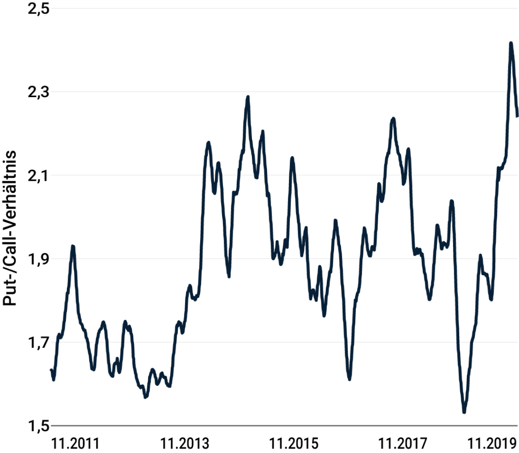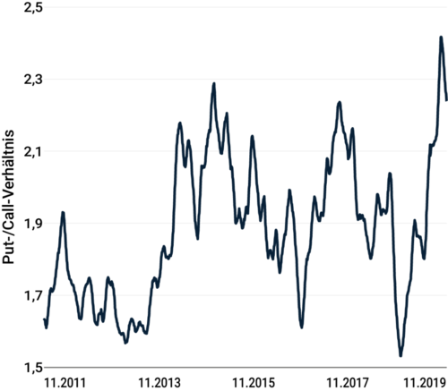 Dieses Verhalten lässt sich aus dem Verhältnis von ausstehenden Put- gegenüber ausstehenden Call-Optionen im S&P 500 Index auf Monatsbasis ablesen. Mit einem Wert von 2,2 ist dieses Verhältnis deutlich höher als vor vorangegangenen Marktkorrekturen. Eine höhere Kennzahl reflektiert eine höhere Nachfrage nach Put-Optionen, welche hauptsächlich zur Absicherung gegen Aktienmarktrückschläge eingesetzt werden. Daher wird diese als Sentiment-Indikator verwendet und zeigt, dass Investoren deutlich vorsichtiger agieren.