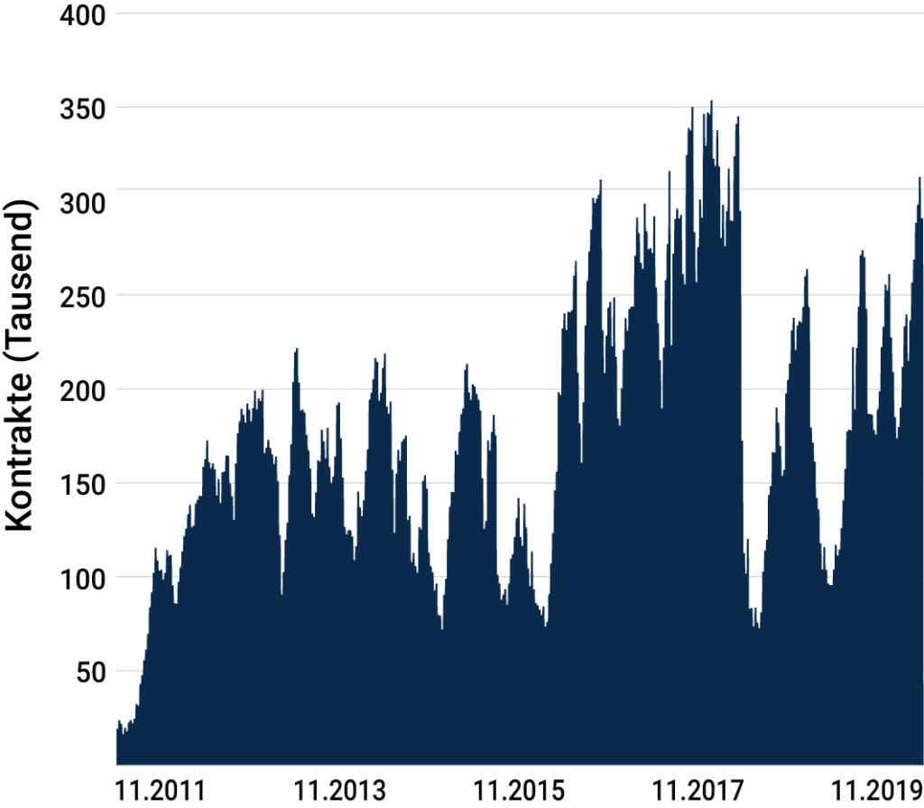 1 Quellen: Bloomberg, „The Short-Volatility Trade Is Now So Big It’s Starting to Break”, Stand: 22.10.2019, “Record Short VIX Positioning Reflects a Ton of Fear Elsewhere”, Stand: 04.11.2019; Seeking Alpha, “Market Volatility Bulleting: Short VX Futures Positioning At All-Time Record. And That’s Okay.” Stand: 12.11.2019; Zero Hedge: VIX Futures Hit New Record Short: Is A Historic Volatility Squeeze Coming?“