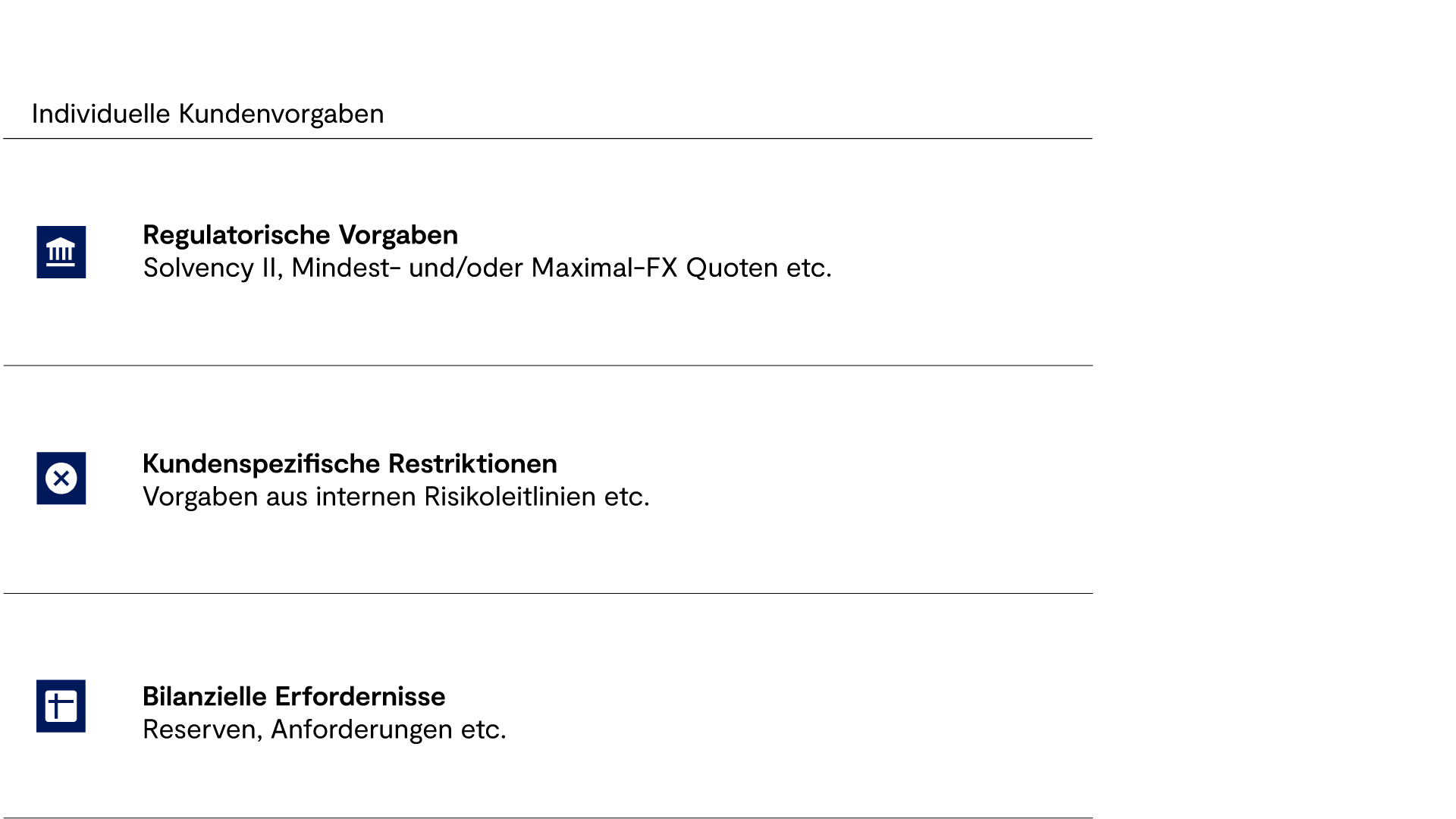 Die Fremdwährungsbestände eines Kunden sind häufig über unterschiedliche Mandate und Investment-Vehikel verteilt (beispielsweise Direktbestand, Masterfonds, Spezial- und Publikumsfonds im In- und Ausland, ETFs etc.). Daher stellen Transparenz in der Umsetzung sowie die Möglichkeit, die Währungsbestände in unterschiedlichen Aggregationsstufen abzubilden, die Grundlage eines fundierten Overlay Managements dar.