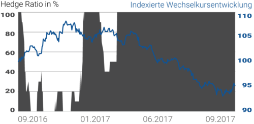 Abbildung 3 zeigt exemplarisch die Wirkungsweise eines aktiven Currency Overlays anhand einer USD-Long-Position im Zeitraum von Oktober 2016 bis September 2017. Dies ist ein gutes Beispiel für den Mehrwert einer aktiven Sicherungsstrategie. Während die weitreichend ungesicherte Position im vierten Quartal 2016 deutlich an der positiven Marktentwicklung partizipierte, konnte der aktive Aufbau der Sicherung Ende 2016 die Position bis zum September 2017 weitestgehend absichern.