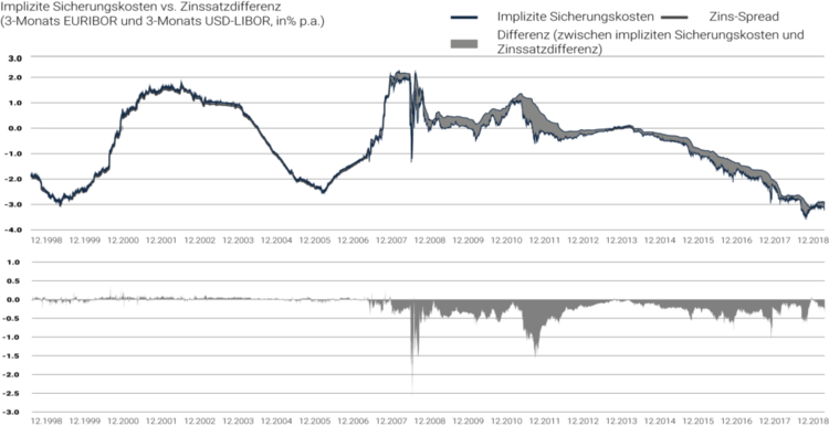 Neben einem unterschiedlichen Zinsniveau kann das Phänomen des Cross-Curreny Basis Spreads die Sicherungskosten beeinflussen. Vereinfacht ausgedrückt ist dieser ein Maßstab für das Angebots- und Nachfrageverhältnis zweier Währungen und ist seit 2008 strukturell negativ für einen EUR-basierten Investor, der USD-Bestände absichert. Dieser sollte beachtet werden, da er eine unmittelbare Implikation auf die Kosten einer Währungssicherungsstrategie hat. Im Unterschied zu einem höheren Zinsniveau wird ein Investor nicht für den Basis Spread vergütet.