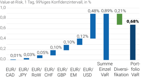 Dazu ist das potentielle Verlustrisiko, wie es aus einer Währungsabwertung resultiert, der möglichen Liquiditätsbelastung durch die vorgesehenen Absicherungsgeschäfte erfolgend aus einer Fremdwährungsaufwertung gegenüberzustellen. So zeigt etwa die Analyse des Value-at-Risk der gesamten Währungsallokation sowohl die ökonomischen Risiken des ungesicherten Währungsportfolios als auch die Diversifikationseffekte aus der Allokation (siehe Abbildung 1).