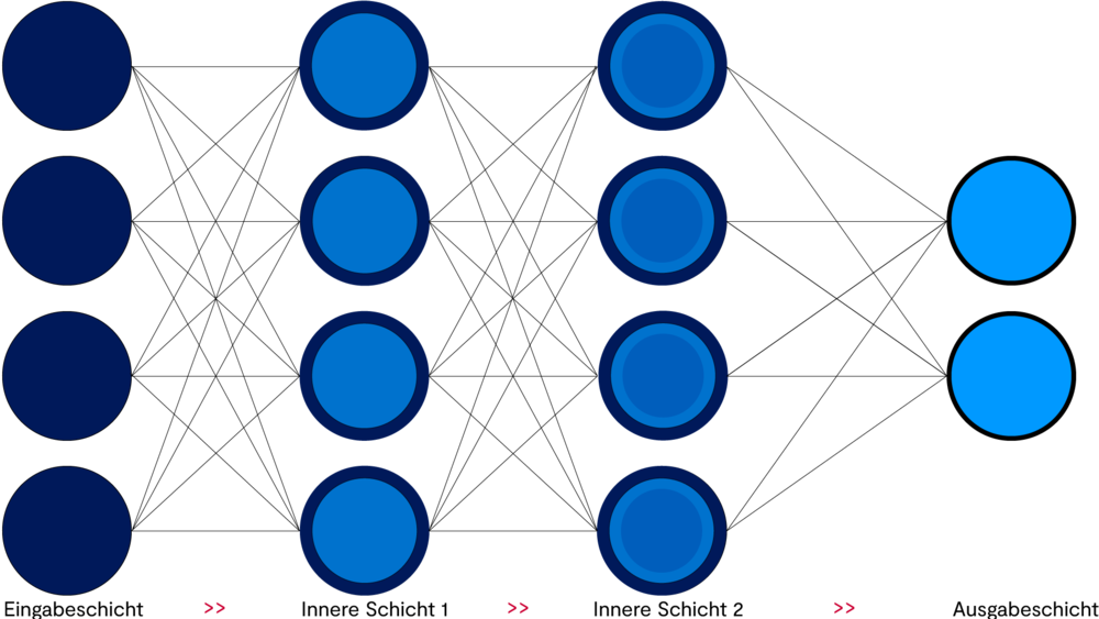 Neuronale Netze verarbeiten Daten über eine Reihe von hintereinander geschalteten und untereinander vernetzten Schichten.